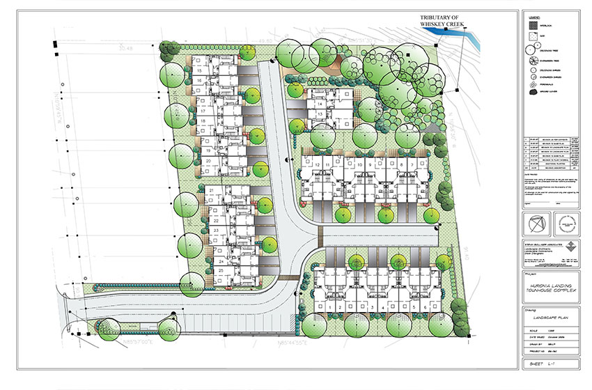 This townhouse development in Barrie, Ontario was designed to utilize the existing surrounding green space on the property. Initial planting throughout the site enhanced the streets of the community and created privacy between the homes. The Bradford Pear trees exemplify the scale of the development without overwhelming the space. The property includes an amenity space with a gazebo, giving the residents and their visitors a place to lounge and socialize with each other. The townhouse complex evokes a sense of community and is a neighbourhood that the residents take pride in.
